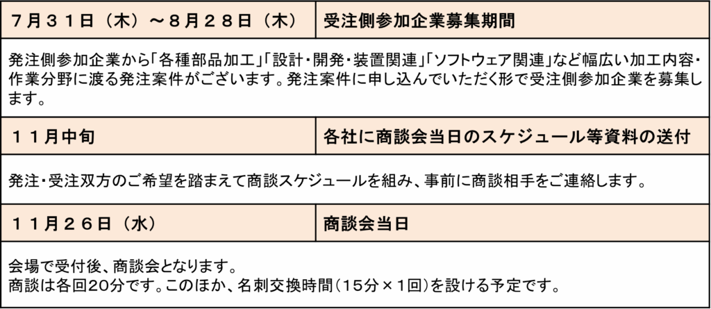 ■商談の組合せは、申込時の希望と発注側参加企業の意向を合せて調整を図り、開催日までに「商談スケジュール表」を送付する予定です。商談希望が特定の発注側参加企業に集中した場合等、ご希望に沿えないこともありますので、予めご了承ください。