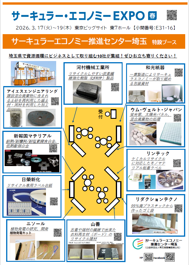 このたび、サステナブル経営WEEKの構成展である「サーキュラー・エコノミーEXPO」に、サーキュラーエコノミー推進センター埼玉特設ブースを設けます。