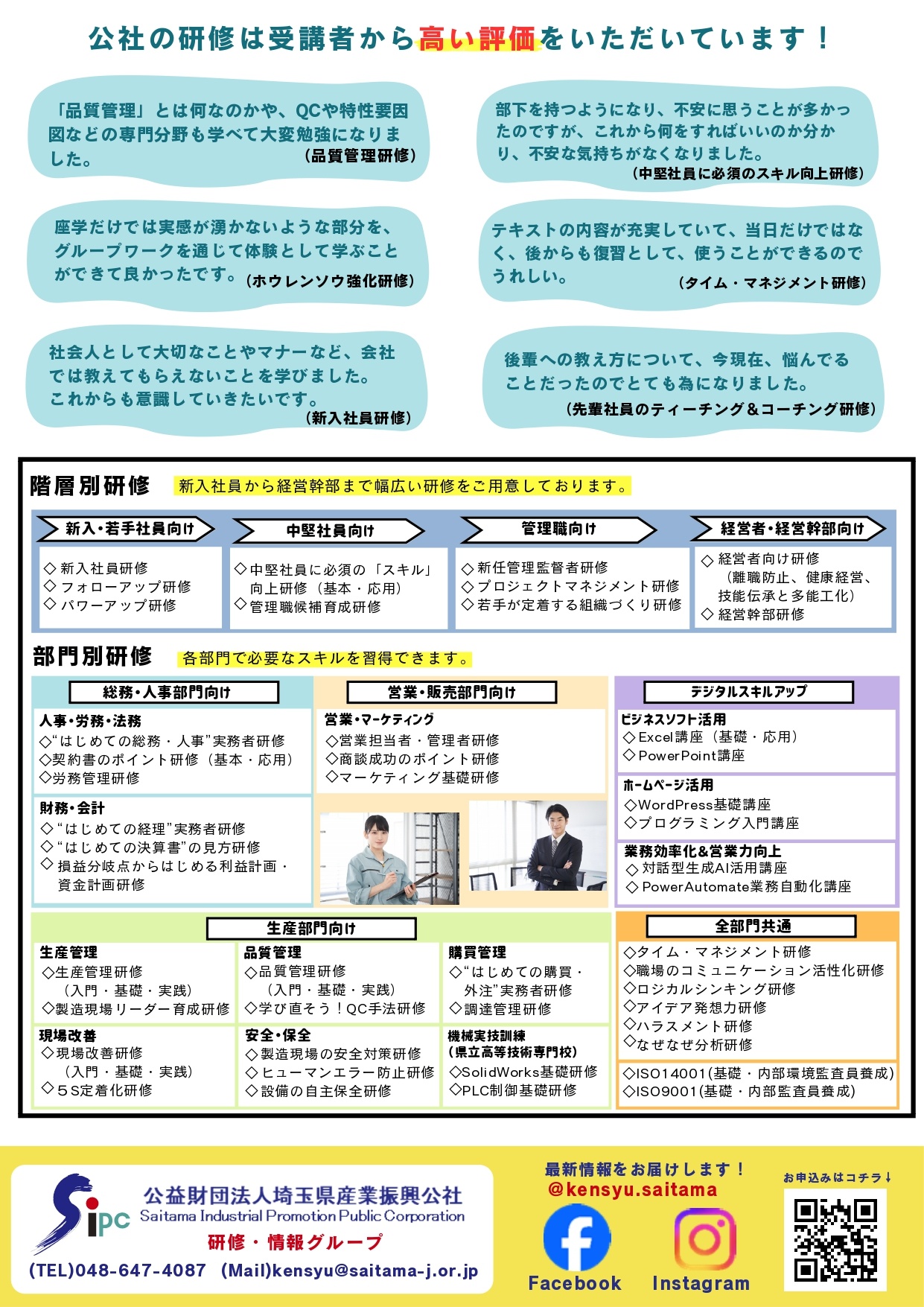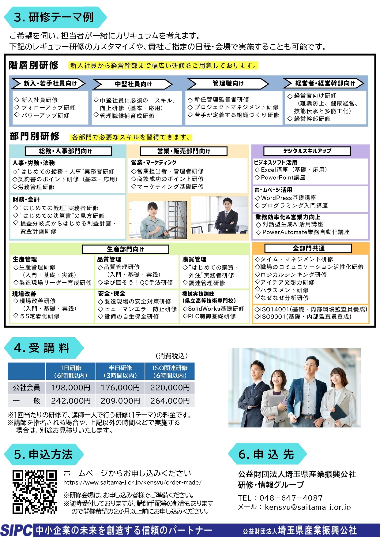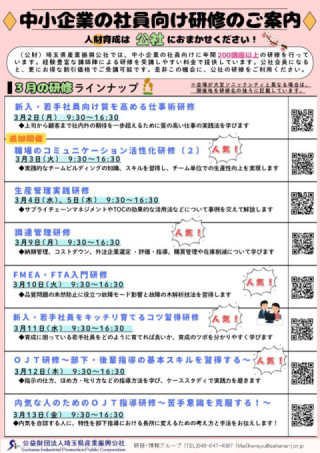 新入社員から経営幹部までの階層別研修や生産管理、現場改善、品質管理、ISO、財務・会計、人事・労務、営業などの実務研修を行います。Excel、PowerPointなどのビジネスソフト活用やホームページ活用など、パソコンを使用した実践研修も行っています。