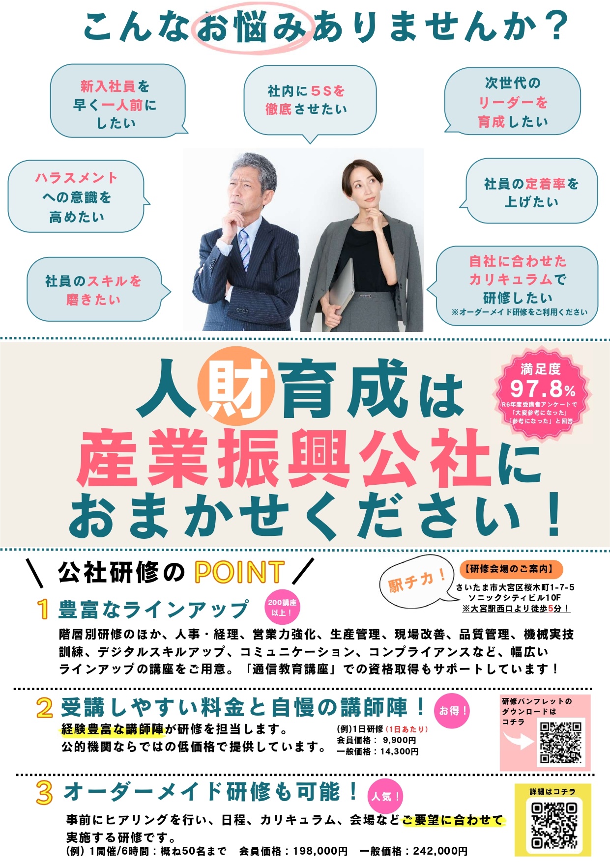 企業にとって、人手不足が深刻化している今、人材確保・人材育成が大きなカギとなっています。採用や人材活用のノウハウについて、ご相談ください。企業の皆様のご要望に合わせて、多岐にわたるテーマの研修も開催しております。