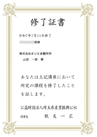 公社研修の修了証書の発行について 研修の修了証書をご希望の方は、下記「修了証書申込みフォーム」にて発行依頼してください。※修了証書はPDFにてメールで送付させていただきます。 修了証書申込みフォーム 会社名 担当者名※必須 様例)総務課 埼玉太郎 メールアドレス※必須 電話番号※必須 例)048-647-4087 講座名(もしくは講座コード)※必須 例)原価管理研修Ⅰ(22KEE) 開催日※必須 例)5/30、5/31 受講者名(複数名記入可)※必須 様例)埼玉二郎、埼玉三郎 申込受付確認票の発行 申込受付確認票の発行も希望する 以下の「プライバシーポリシー」に同意の上、確認画面へお進みください。「プライバシーポリシー」 プライバシーポリシーに同意する 確認画面へ