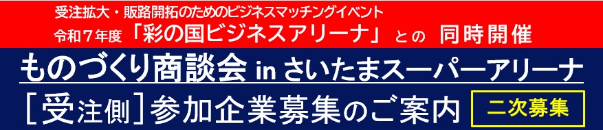 このほど、「令和7年度彩の国ビジネスアリーナ」出展者を対象とした一次募集に続き、埼玉県内中小企業を対象に加えた受注側参加企業の二次募集を行います(出展者も引続き申込可)。新規取引先の開拓や新たなビジネスチャンスをつかむ機会として、ぜひご活用ください。