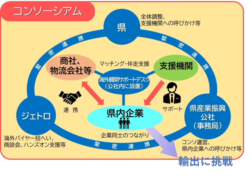商社、物流会社、商工団体、金融機関等の幅広い企業・団体等が参加し、海外マーケットでの販路開拓を支援するとともに、企業同士がつながる場を創出して海外でのビジネスチャンスにつなげます。
