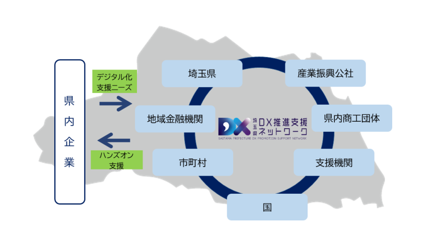 埼玉県は、県内企業のDXを推進するため、令和3年10月に国、県、市、経済団体、金融機関と連携して「埼玉県DX推進支援ネットワーク」を立ち上げました。