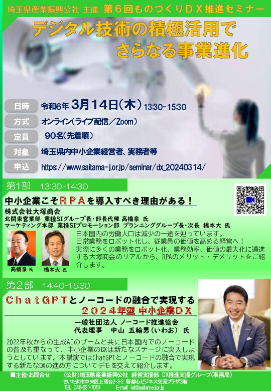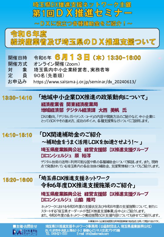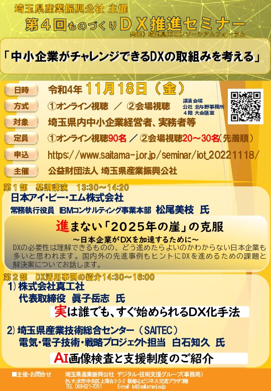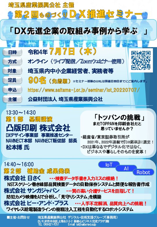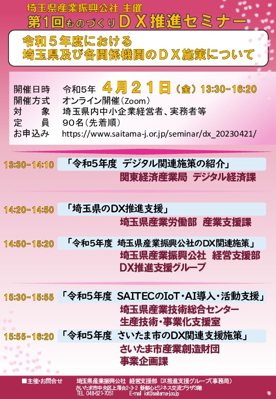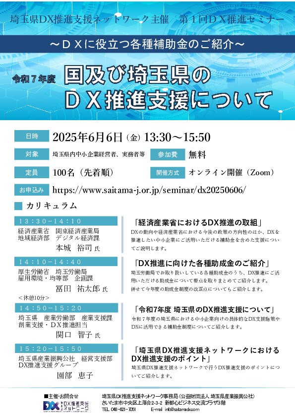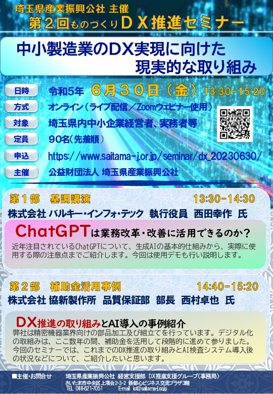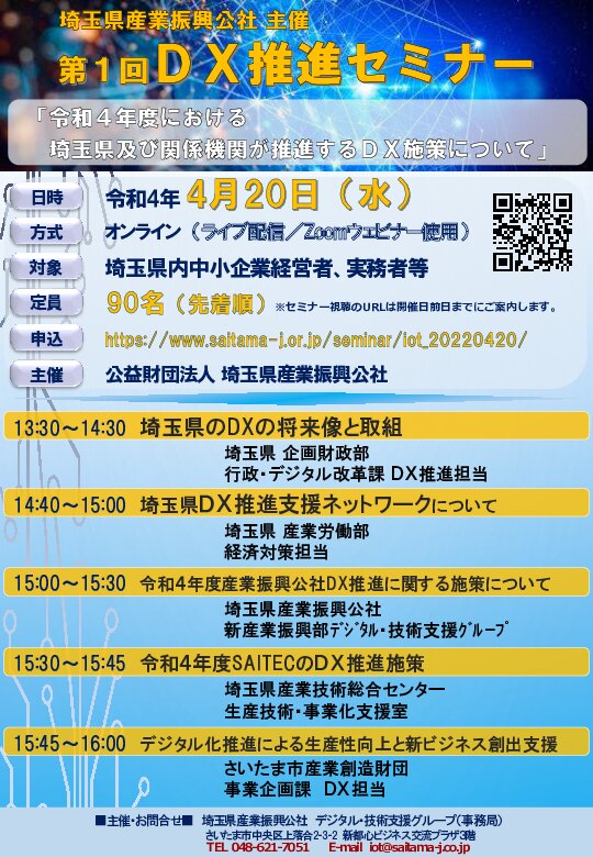 埼玉県内中小企業の経営者、実務者等を対象にしたセミナー(年4回開催/参加費無料)です。DX(デジタル活用を含む)に関する最新動向や導入事例、AI・IoT等デジタルテクノロジーに関する各種ツール紹介、国や県の政策・事業や補助制度などを紹介します。