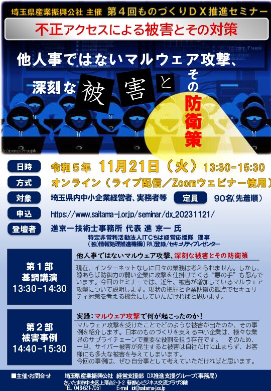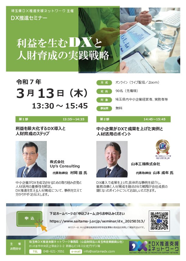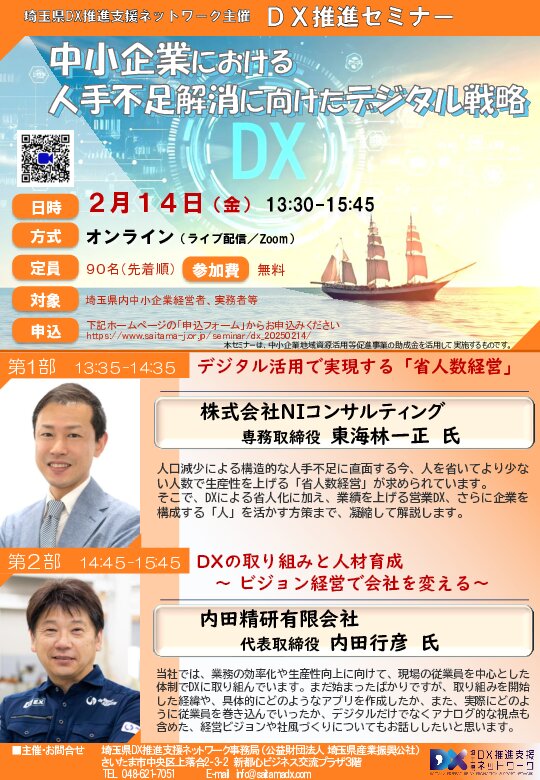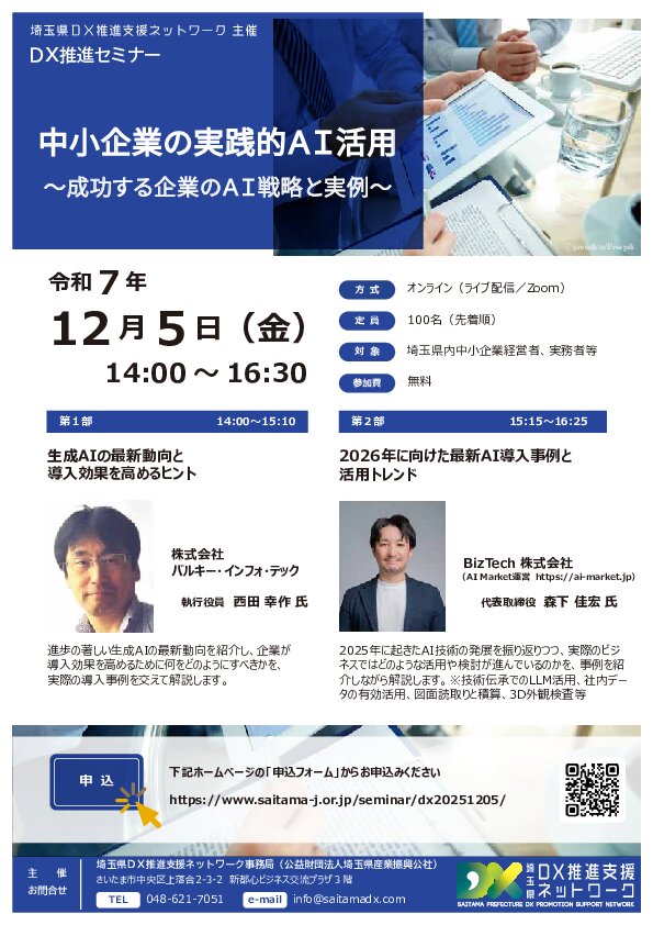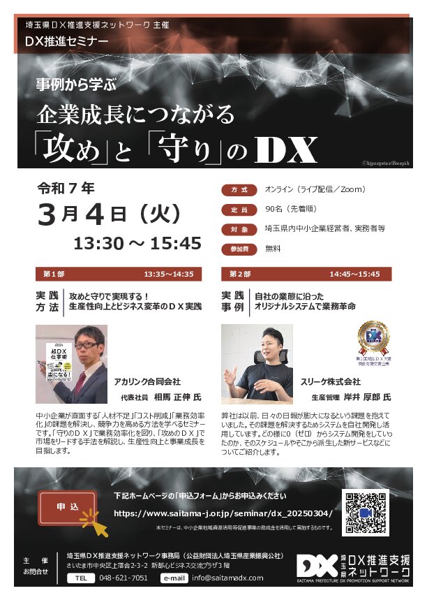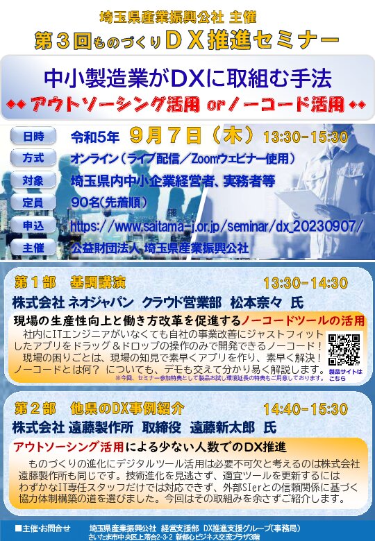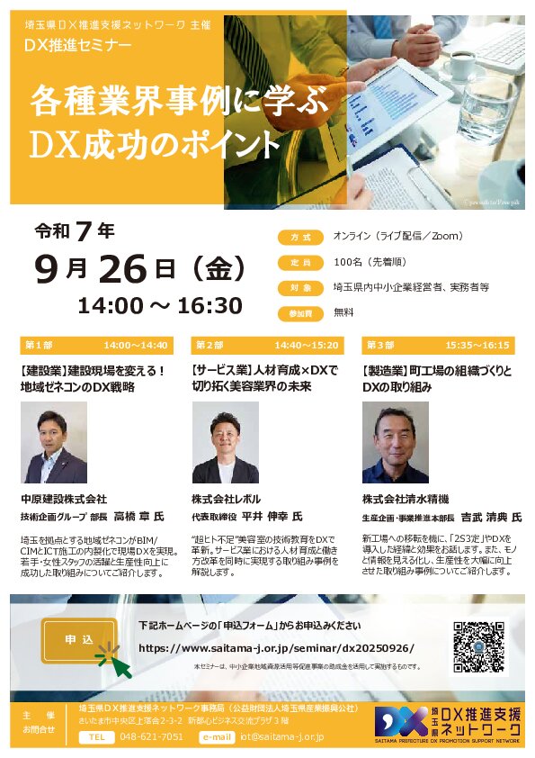 埼玉県内中小企業の経営者、実務者等を対象にしたセミナー(年4回開催/参加費無料)です。DX(デジタル活用を含む)に関する最新動向や導入事例、AI・IoT等デジタルテクノロジーに関する各種ツール紹介、国や県の政策・事業や補助制度などを紹介します。