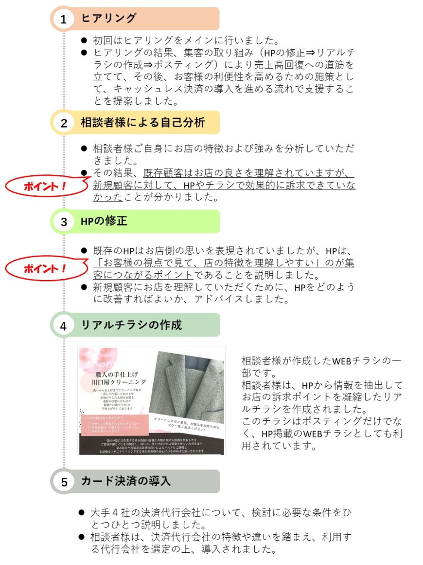 ▶具体的には、伝わるHPの作成を支援。HP修正後に、リアルチラシの作成とポスティング、キャッシュレス決済の導入という流れで支援することを提案