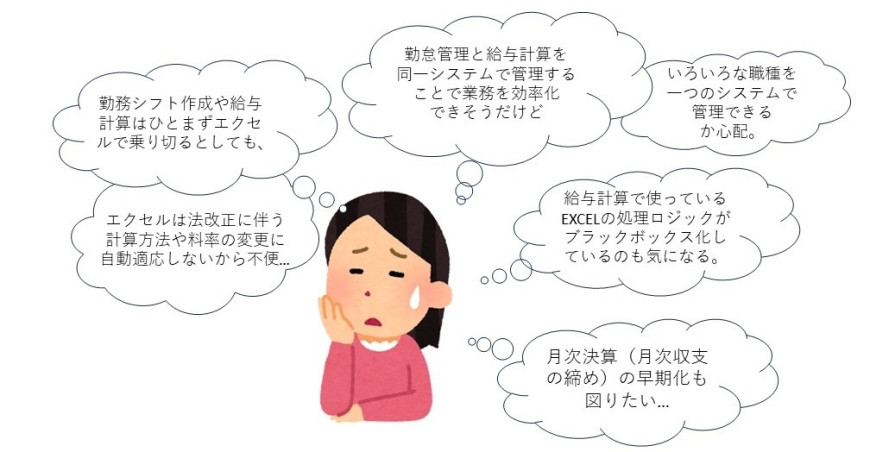 新たな勤怠管理システムを導入するだけでなく、これまで気になっていたことを一気に解決したい、ということで公社にご相談をいただきました。