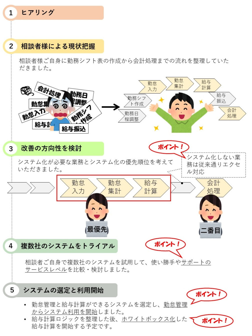 勤怠管理、給与計算、会計業務を主に担っていた代表が高齢となり、早急に業務を引継ぐ必要がありました。この際、代表の頭の中にある作業を、システムを導入してミスなくできるようにしたい、という希望があり、相談させていただきました。