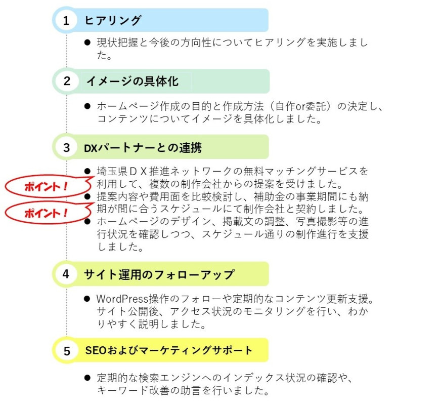 しかし、ホームページ作成のノウハウや運用について知識不足であったため、埼玉県の事業者支援情報のLINEでDXコンシェルジュのことを知り、支援をお願いしました。