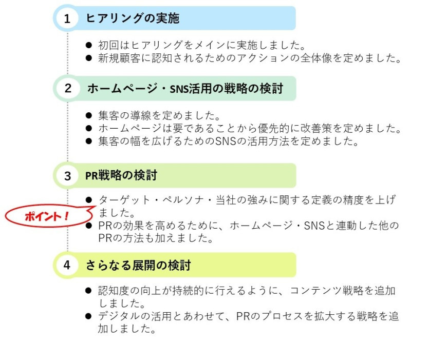 - 当社の定めるターゲット・ペルソナや顧客の求めるニーズを明確に定めたうえで、導線上のコンテンツが整った。今後は、この導線上に新たな集客の施策を追加していくことが可能となり、PRのストーリーが定まった。