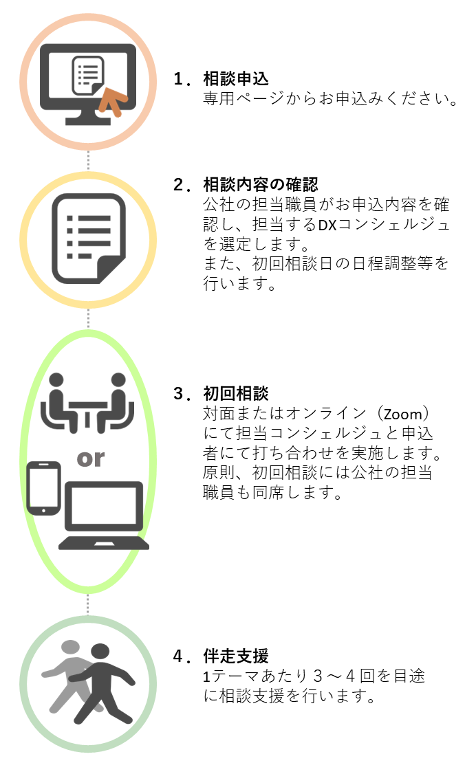 ▶1テーマあたり3~4回を目途に相談を継続的に行う伴走支援です。