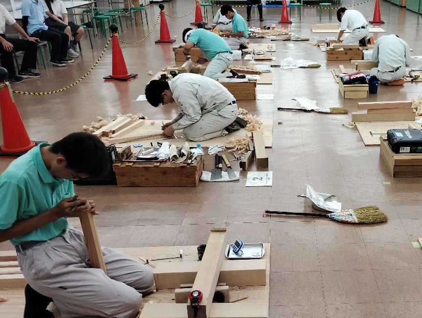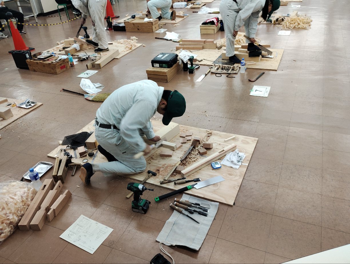 競技課題は配布された材料を使用し、仕様および課題図に従って、木造り、墨付け、加工、組立を制限時間内(3時間30分)に完成させるものです。