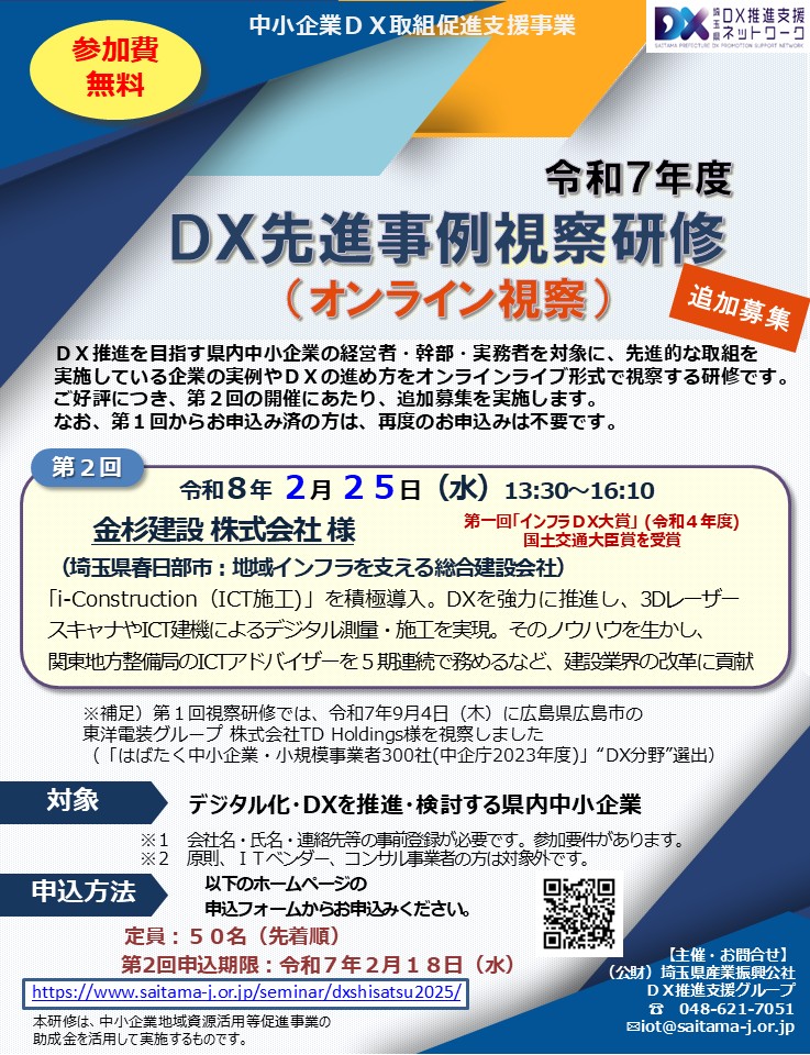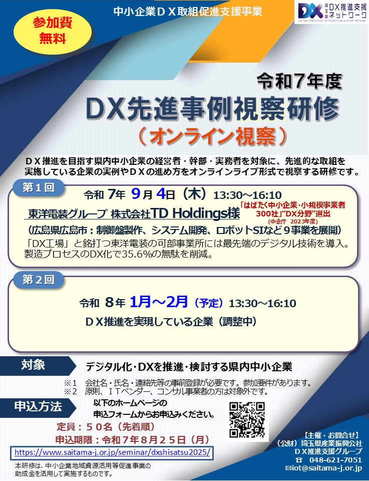 公益財団法人埼玉県産業振興公社では、DX推進を目指す県内中小企業の経営者・幹部・実務者を対象に、先進的な取組を行っている企業の実例やDXの進め方を視察いただくため、オンライン視察研修を実施します。