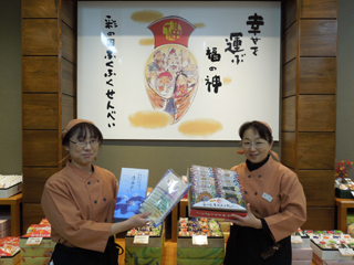 - 片岡さんの一押し商品は、国産米100%を使用した氷川餅。「埼玉の代表的なおみやげにしたい」と話す。また、せんべいの他に黒豆茶の販売にも力を入れ、安定した売上げを続けているという。黒豆茶販売は、お客様の健康を願って始めた、店先での黒豆茶サービスがその原点。そのほか、サクサクおかきも人気商品。食感が絶妙で香ばしさが口いっぱいに広がる御菓子だ。