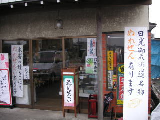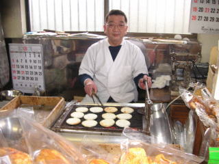 | 「一度、いろいろな手焼きのせんべいの味をご賞味ください。お客さんのお好みの堅さ、味で焼き上げます。」 |