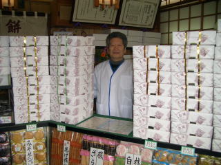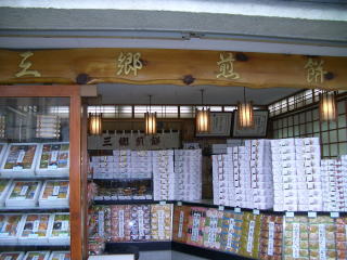 - 商品が前の通りからよく見えるような工夫をしている。堆く積まれた化粧箱入りの煎餅は、一目で分かるこの店のシンボル的な特徴。