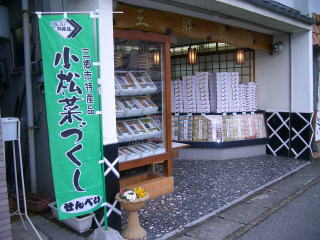 - 「御煎餅は年配者のもの」という感覚でなく、若者に受けがよい商品も置く。変わり種煎餅として、店主が発案し、商工会が認定した「小松菜煎餅」の製造販売にも力を入れている。これは、三郷で生産量第一位の野菜、小松菜を煎餅の生地に練り込んだもので醤油や唐辛子など数種の味付けを取り揃えている。また、焼く前の緑色の生地をディスプレーするなど工夫をしている。