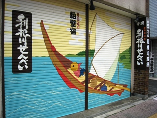 (店名にあわせ、市の中心部を流れる「古利根川」と高瀬舟が描かれている。)