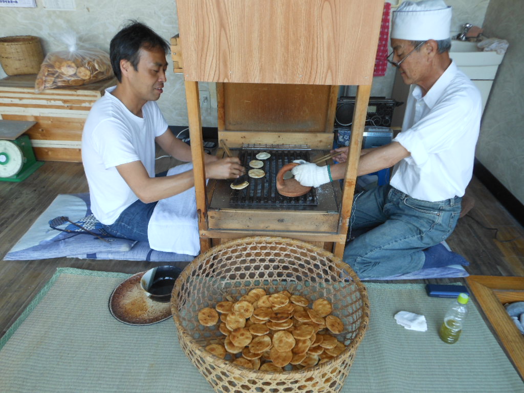 - 午前中は、親子二代で店頭で手焼き煎餅を製造しています。
