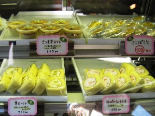 - 店内には、さつまいもを使った「芋ロール」や「芋どらアイス」など、手づくり和洋菓子約20種類が並ぶ。