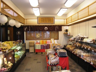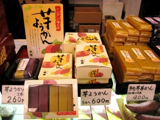 - 店内には、自家製の飴15種類と芋ようかんなどの芋菓子が並ぶ。